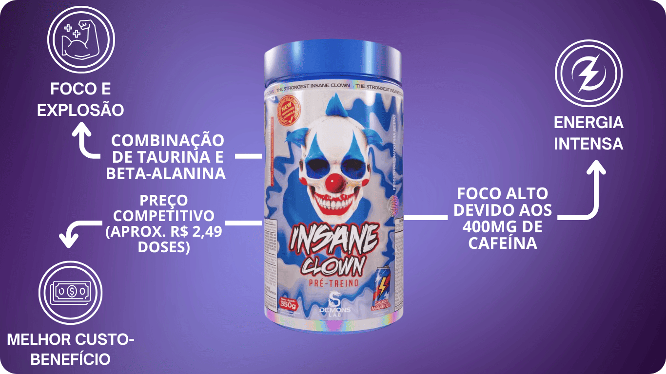 A Demons Lab é conhecida por desenvolver produtos de alta performance para atletas exigentes. O INSANE CLOWN é o pré-treino ideal para quem busca resultados rápidos e eficazes, com uma fórmula poderosa que não decepciona.